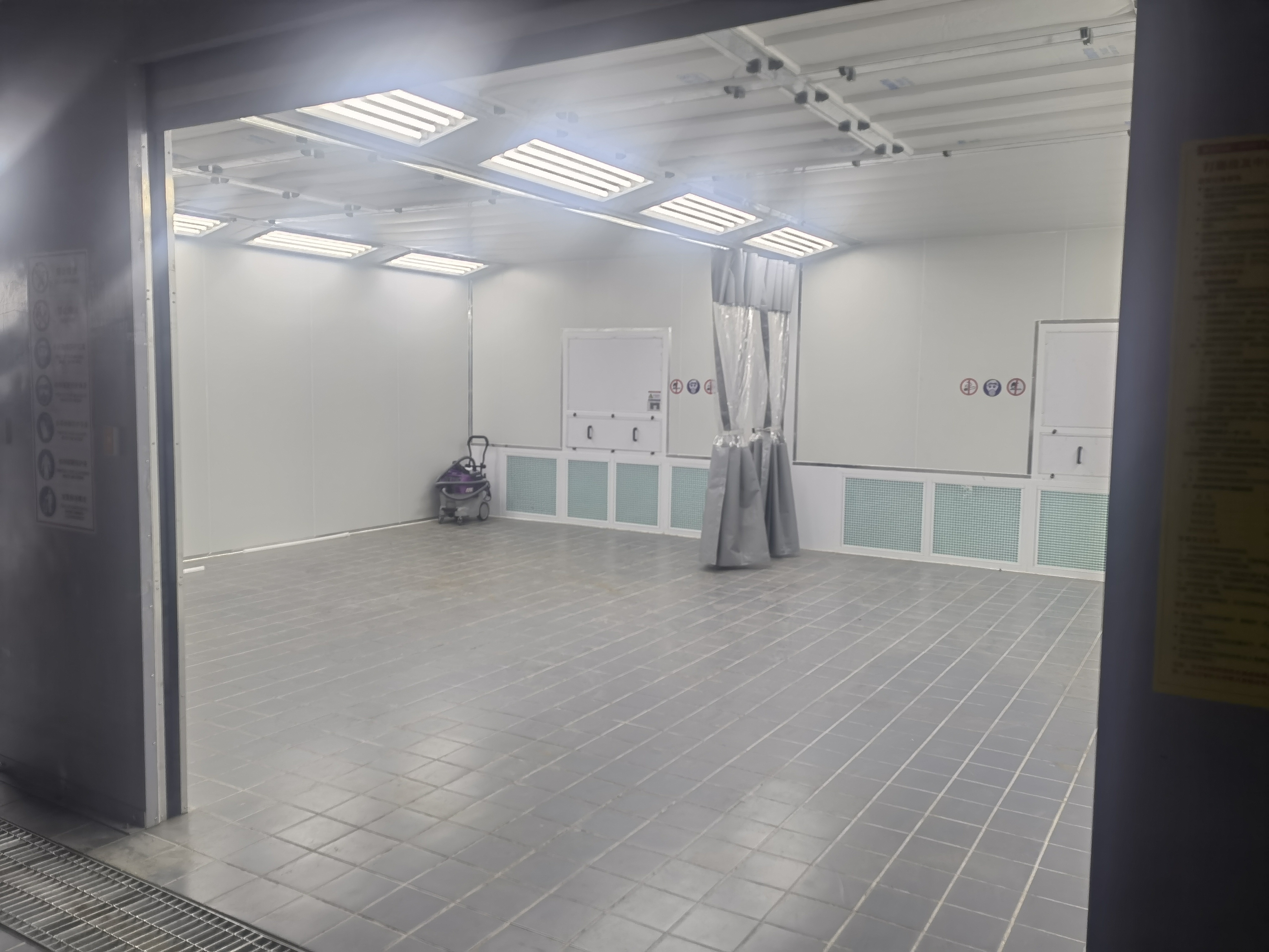 공기 흐름 설계(반 다운드래프트) 작업장에서 상부 플레넘 필터를 통해 공기를 흡입하여(공기 정화), 차량 위로 아래로 이동하여 샌딩 먼지 및 프라이머 오버스프레이를 포집하고, 후면 벽 또는 바닥 구덩이를 통해 배출합니다. 이렇게 하면 기술자가 깨끗한 공기를 흡입할 수 있습니다.