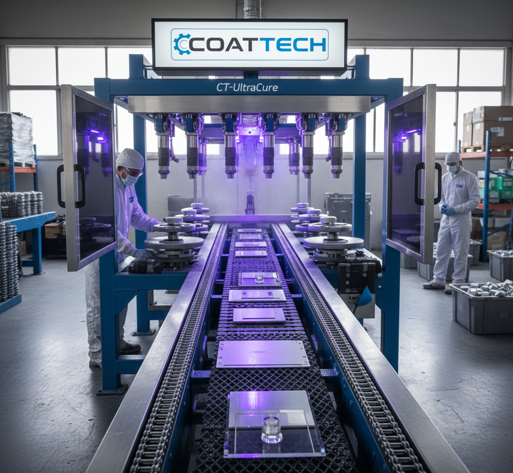 CT-UltraCure는 UV 감응성 물질로 코팅된 평평하거나 낮은 프로파일 부품의 즉시 경화를 위해 설계되었습니다. 부품은 고강도 수은 또는 LED UV 램프 아래의 빛 차단 터널을 통과하여 즉시 경화됩니다. 이를 통해 부품을 라인 끝에서 즉시 쌓거나 포장할 수 있습니다.