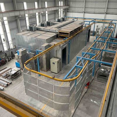 산업용 오버헤드 자재 취급 시스템이 분체 도장 및 제조 시설을 통해 금속 부품을 라우팅합니다.